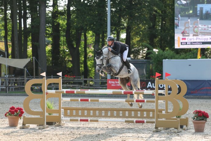 COVALLIERO ist ein Sportler vom Scheitel bis zur Sohle und stammt aus einem der besten Mutterstämme der Welt. Dieser strahlende Sohn des Comme il fault überzeugte von Beginn seiner sportlichen Karriere und absolvierte seine Hengstleistungsprüfung mit einer Endnote von 8,95. Covalliero ist siegreich und mehrfach hochplatziert in Springpferdeprüfungen bis zur Klasse M, u.a. konnte er bei den Ladelunder Springtagen die Qualifikation zum Bundeschampionat unter dem Sattel von Hannes Ahlmann für sich entscheiden. Wir glauben das wir mit ihm ein absolutes Ausnahmetalent für große Aufgaben im Stall haben.